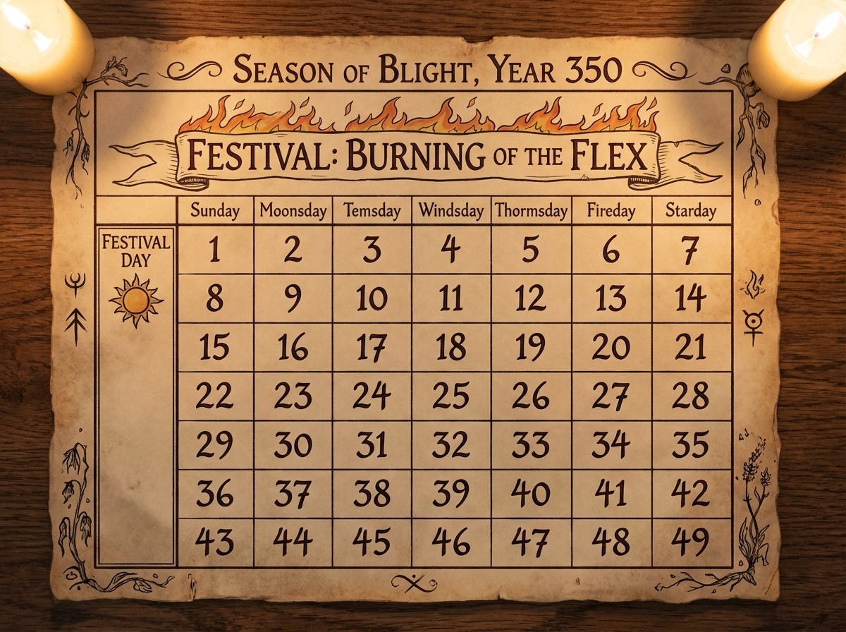 The yield comes in under the goddess of beauty and abundance. The gift is produce, preserves, and cuts of meat — given freely, with the flow of generosity running naturally toward those with least, without shame or ceremony around the direction of it. The season is marked by communal feasts every Starday through all seven weeks. Poor families give what little they have and receive more back than they gave. This is simply what the season is for.Blight / Burning of the Flax / Solenne