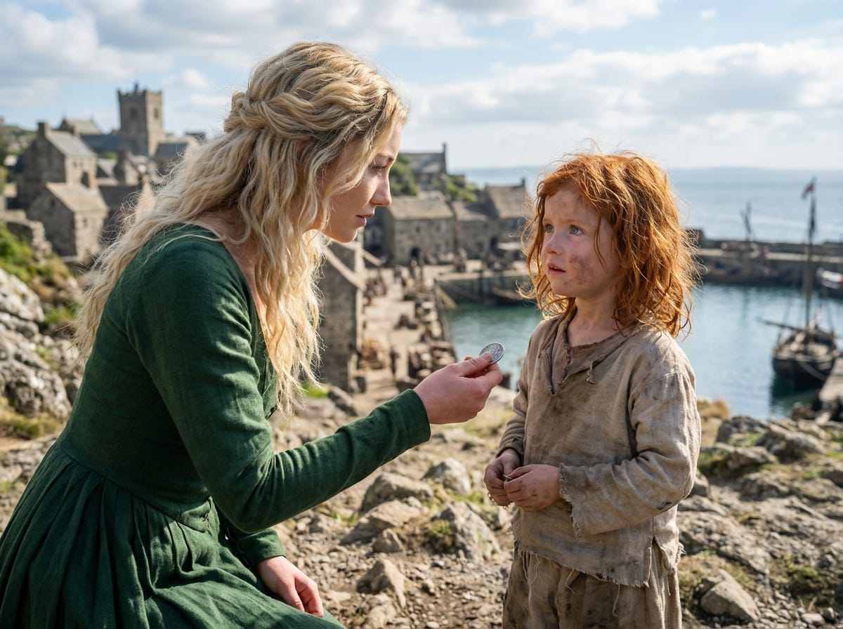 A soft little voice. It belonged to a girl no older than five — a redhead with blue eyes, unkempt hair, dirty face and hands, very rough linen clothing, but a happy smile.