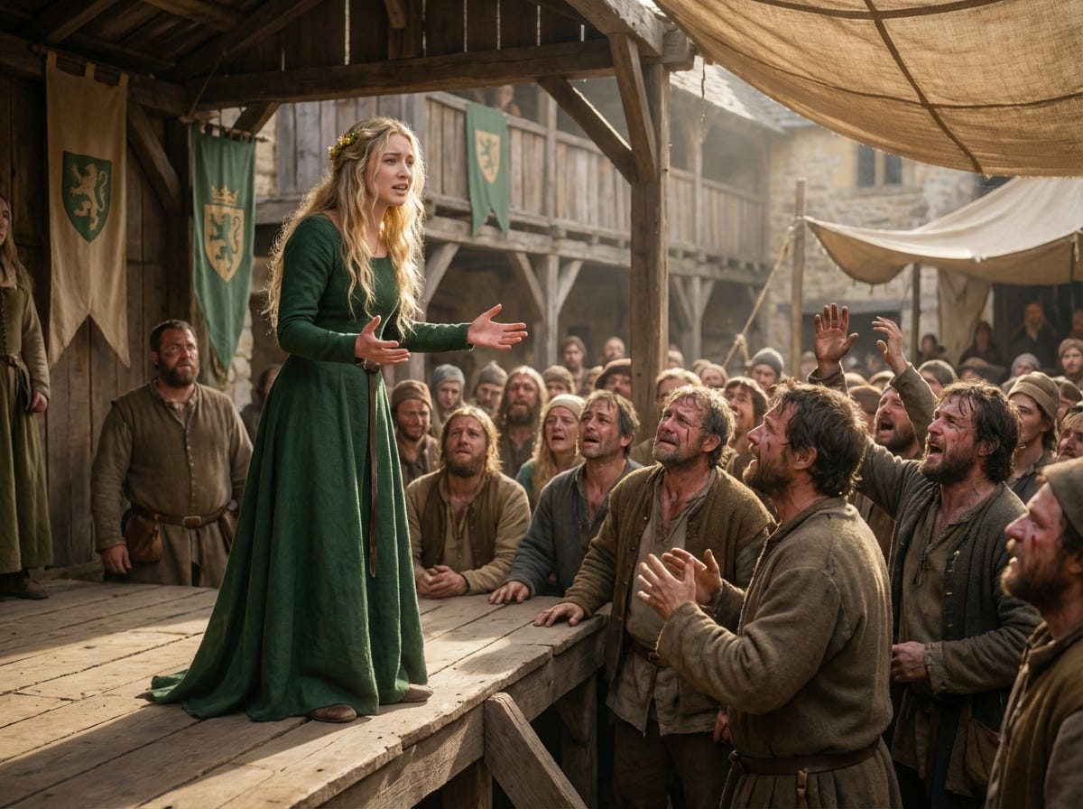 “There is land enough for all,” Scarlet said. “Any adult who serves in my army for not less than three years, and does so honorably, will be granted a heritable land trust of one hundred acres. Man or woman, regardless of birth. A farm to work. A farm that will feed your family and your children’s families. Not as tenants. Not as renters. As owners of the land. You don’t fight for me. You fight for your own futures.”