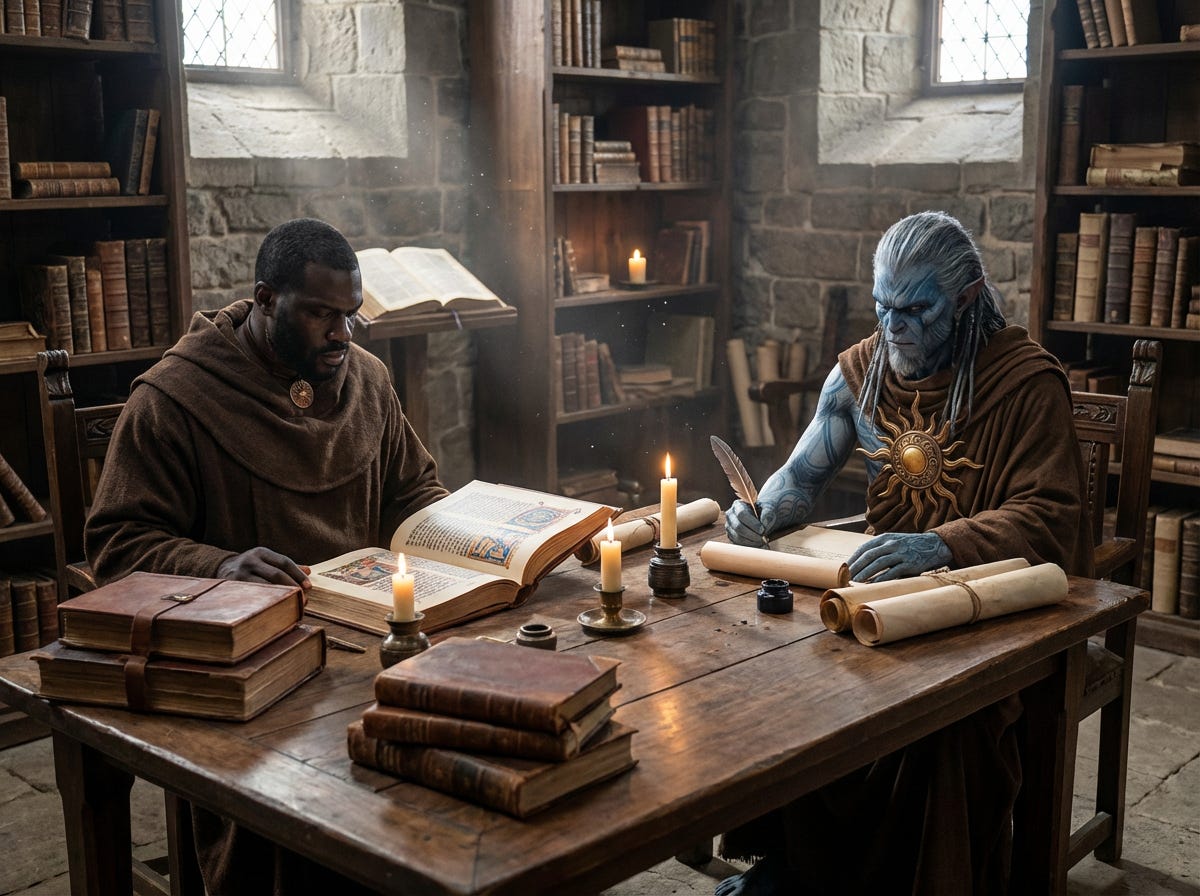 He left the master’s meditation chamber and took the stairs down to the library where an Oroquai man, sat at a table leafing through an ancient tome.