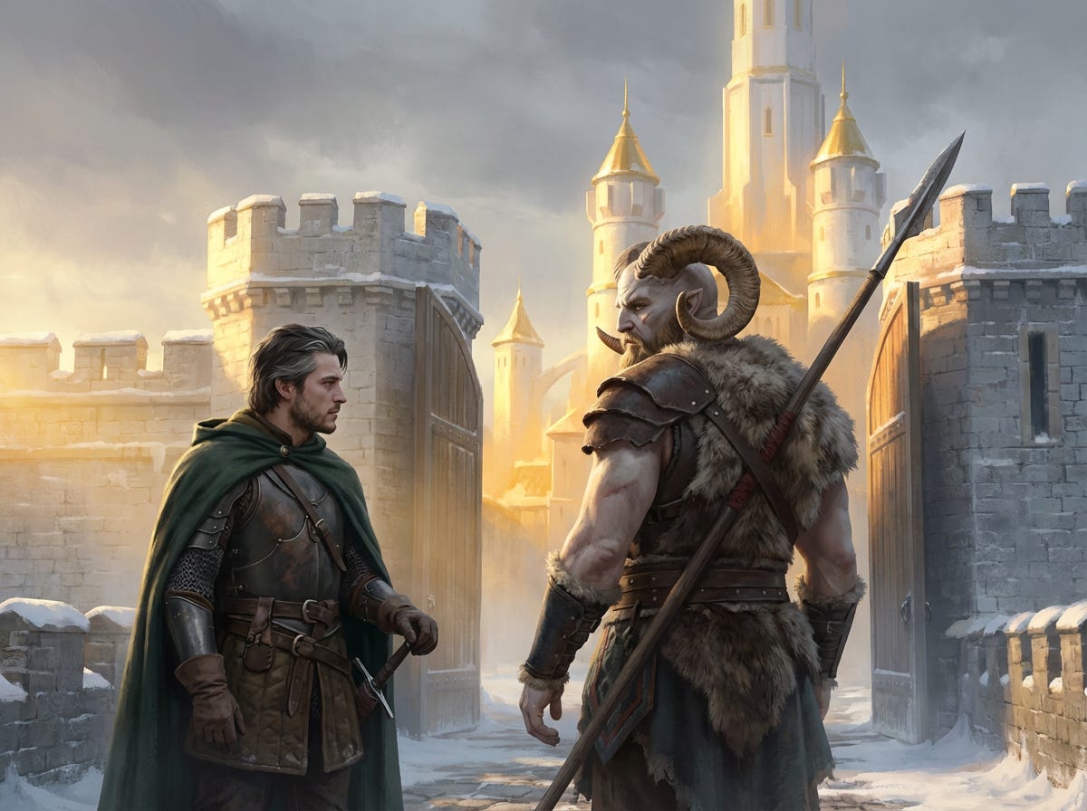 He looked around the courtyard. He felt it then — the awe, arriving late, as awe sometimes does when a man has been too busy surviving to feel it. The white stone. The gold towers. The light that should not have been possible at this hour or this altitude. He was not worthy of this place. He was certain of that in a way that had nothing to do with doubt and everything to do with understanding the size of what he was standing inside.
