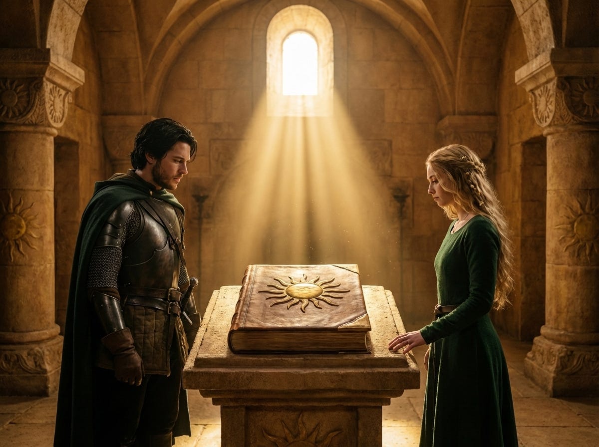 The room beyond was not large. Stone walls, a vaulted ceiling, a single window set so high and narrow it admitted a column of light no wider than a man’s hand. The light fell on a table, and on the table sat the archive. A single bound volume, its cover dark with age, set apart from everything else as though it had always known it would be opened last.