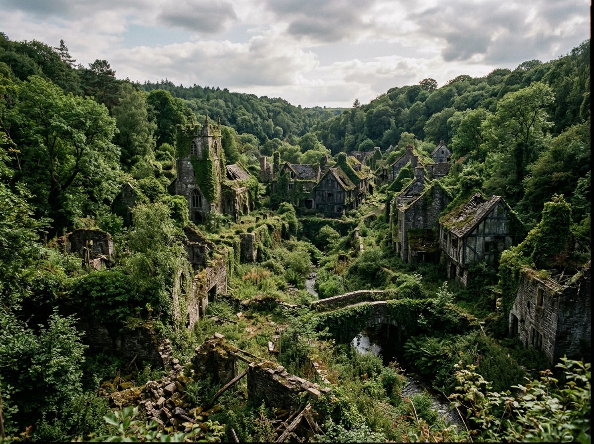 The village revealed itself slowly. A roofline through the leaves. Then a garden wall, still standing, with something that had been roses gone entirely to cane and thorn. A well with a wooden cover warped off its hinges. Doorways standing open to the weather, and inside them the dark and the smell of damp and the beginning of moss.