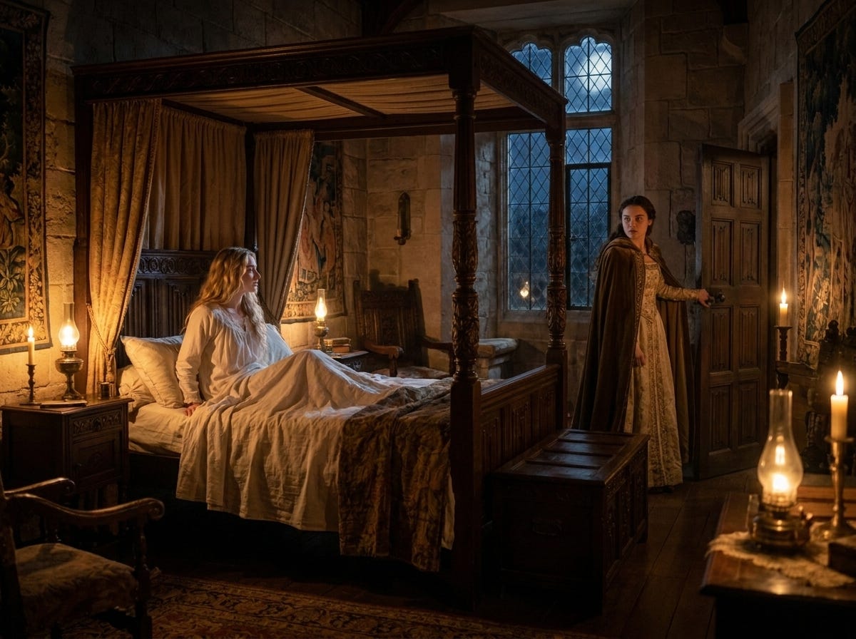 She was already watching the door when it opened. She did not startle. She had heard the soft footsteps, deliberate, the kind that meant to be quiet. She had her hand on the lamp before the figure stepped into the doorway.