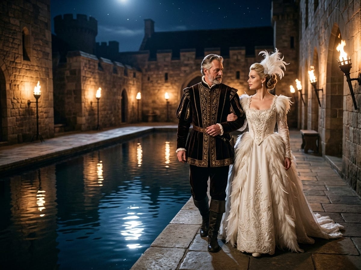 Wyndmere unfurled beyond the ballroom doors into something that felt less like a garden and more like an argumentative wildness refusing to be tamed. Formal hedgerows gave way to wandering gravel paths that lost their certainty in the dark, and lanterns had been strung between the old oaks at intervals just generous enough to make the shadows between them feel intentional. Somewhere water moved — a fountain, or a stream, she couldn’t tell which — and the sound of it threaded through the night air beneath the distant music still drifting from the open ballroom doors.